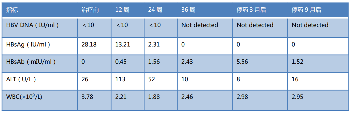 患者治疗36周时HBV DNA检测不到,HBsAg转阴,HBsAb呈上升趋势,肝功轻度异常(ALB 39.3g/L,AST 45U/L),抗核抗体异常(由阴性转为弱阳性),患者治疗效果好,综合考虑,决定停用干扰素,定期复查。