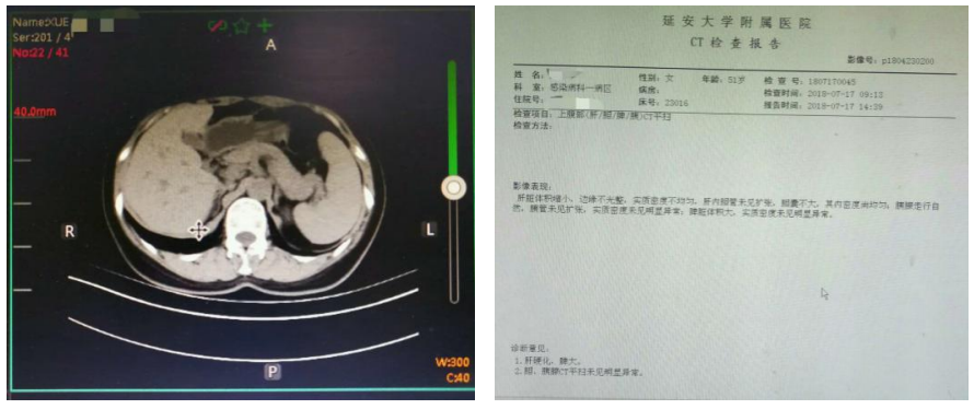 2018年4月门诊查HBV DNA<10 IU/ml,HBsAg 28.8 IU/ml,HBeAg 0.29 S/CO,HBcAb 8.33 S/CO,腹部CT平扫检查示:肝硬化、脾大;胆囊及胰腺未见异常;肝纤维化四项:未见异常;肝功:TP 74.0 g/L,ALB 44.0 g/L,ALT 26 U/L,AST 34 U/L,AIP 104 U/L,TB 22.4 μmol/L,DB 10.3 μmol/L,IB 12.1 μmol/L;患者自觉无特殊不适,查体未见阳性体征。
