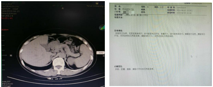 图2.(2019-04-15)上腹部CT平扫:肝脏、胆囊、胰腺、脾脏CT平扫未见明显异常