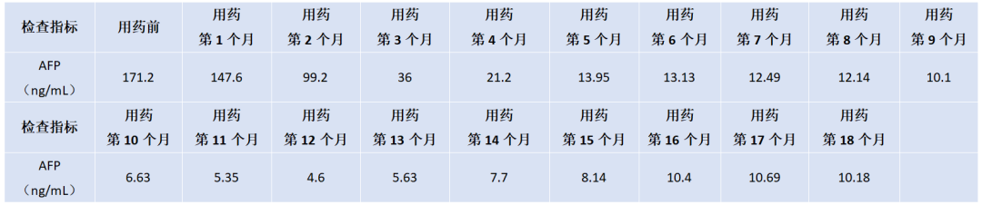 用药后3个月AFP明显下降,用药10个月后AFP降至10 ng/mL以下,详见图1。