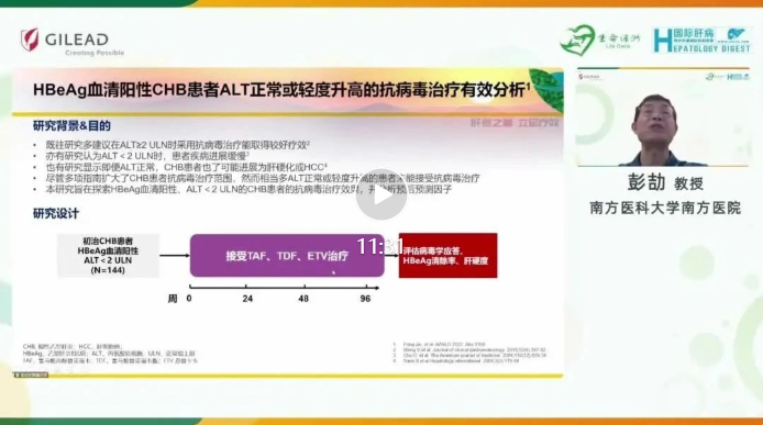 南方医科大学南方医院彭劼教授重点分享了他在本次AASLD年会中报道的一项研究,主要探索乙型肝炎E抗原(HBeAg)血清阳性、丙氨酸转氨酶(ALT)正常或轻度升高的CHB患者予以抗病毒治疗后的疗效及安全性[3]。