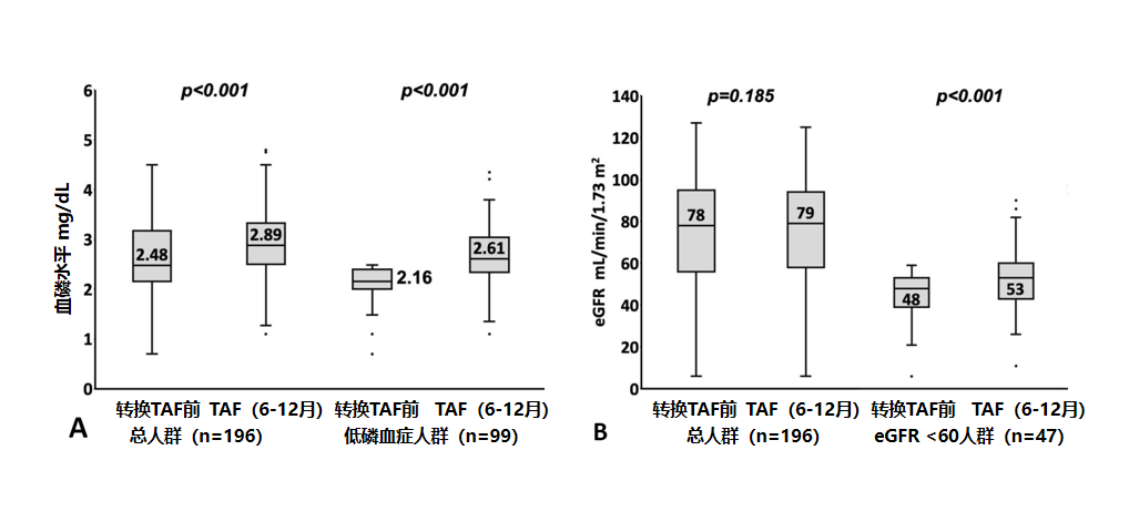 在安全性方面,使用TAF治疗6-12个月后,基线肾小球滤过率(eGFR)<60 mL/min/1.73 m2的患者eGFR得到显著提升(48 mL/min/1.73 m2 vs 53 mL/min/1.73 m2,P<0.001),总人群血磷水平(2.48 mg/dl vs 2.89 mg/dl,P<0.001)及低磷血症(血清磷水平<2.5 mg/dl)的患者血磷水平(2.16 mg/dl vs 2.61 mg/dl,P<0.001)均显著提高,保障了骨、肾安全,且未观察到对血脂的影响。