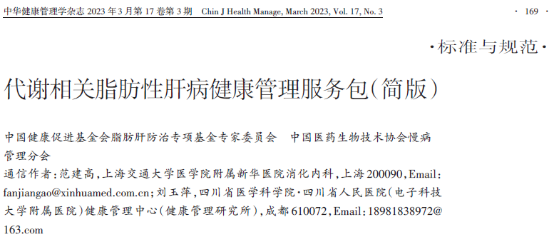 随着肥胖、糖尿病、代谢综合征在我国的流行,代谢相关脂肪性肝病已成为我国健康体检人群肝酶增高和脂肪肝最常见的原因。为给我国一般人群和高危人群提供规范且智慧的健康管理服务,中国健康促进基金会脂肪肝防治专项基金专家委员会与中国医药生物技术协会慢病管理分会共同组织相关专家制定了具有中国特色的《代谢相关脂肪性肝病防治健康管理服务包(简版)》,并于2023年3月正式发表在《中华健康管理学杂志》。