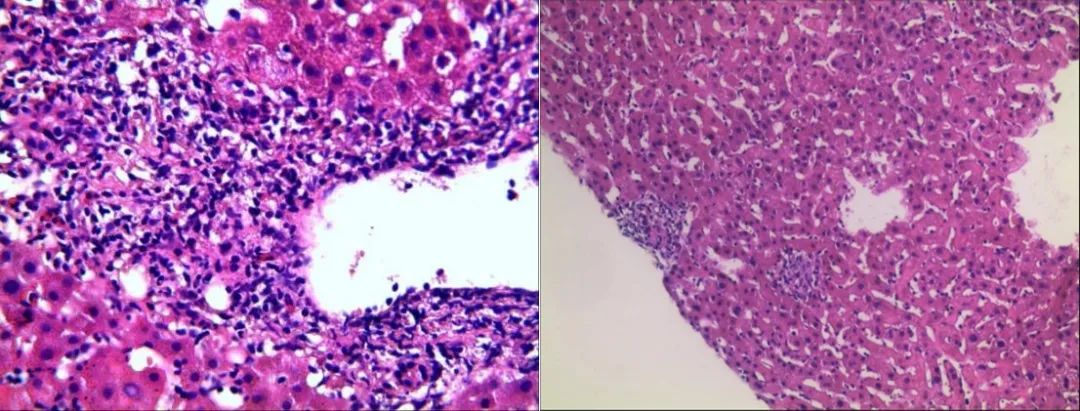 图2. 行右肝穿刺,肝组织结构大致正常,未见淤胆及脂变,肝实质散在点状坏死灶及慢性小肉芽肿结节分布;全切片查见5个较为完整的汇管区,小胆管轻度扩张,数目不增加,管周较多淋巴细胞、浆细胞及少量中性粒细胞浸润,侵蚀界面,个别汇管区组织细胞聚集、小肉芽肿形成。
