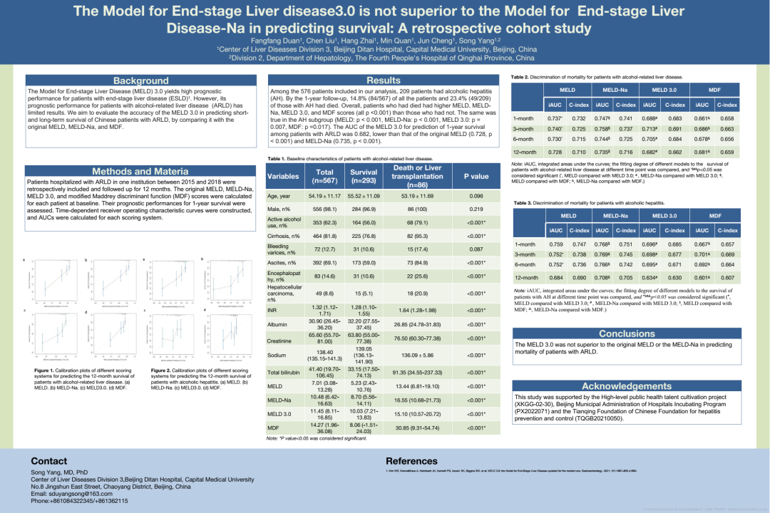 2023年11月10日~14日,肝病学领域国际年度压轴大戏——美国肝病研究学会年会(AASLD2023)于美国波士顿隆重举行。首都医科大学附属北京地坛医院杨松教授团队在酒精性肝病领域的两项科研成果入选大会壁报交流,其研究发现:以L3-SMI定义的肌少症是中国大陆酒精性肝病患者生存的独立预测因素,MELD 3.0在预测中国酒精性肝病患者生存方面的作用并不优于MELD-Na。《国际肝病》特此报道,相关内容分享如下。