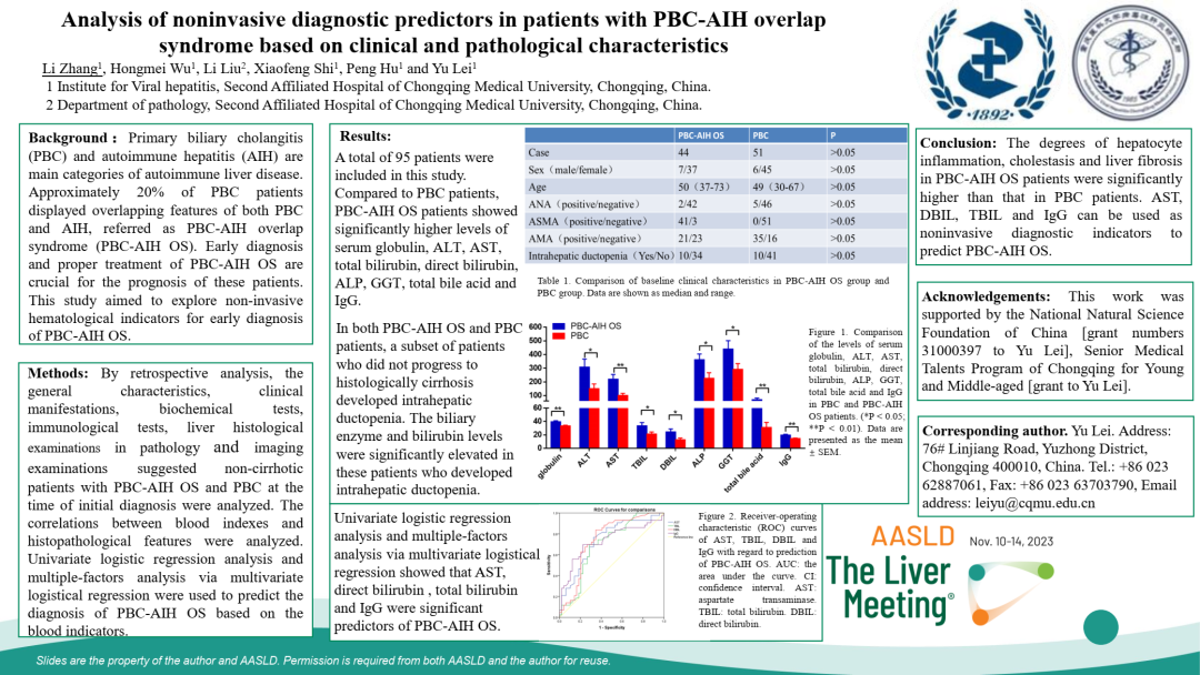 [1] Zhang L, Wu H, Liu L, et al. Analysis of noninvasive diagnostic predictors in patients with PBC-AIH overlap syndrome based on clinical and pathological characteristics. AASLD 2023. Poster 4531-C.