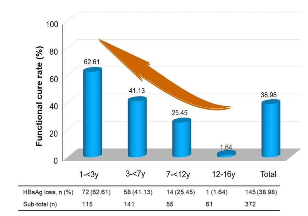 此外,来自湖南省儿童医院发表的一项研究表明,患儿接受抗病毒治疗,起始治疗年龄越低,临床应答率越高。数据显示,治疗后,1~3岁年龄组患儿出现HBsAg转阴时间较早;整体上看,各年龄组中的多数患儿均在治疗后40个月出现临床结局(图4);我们国家感染性病临床医学研究中心团队在免疫清除期的慢乙肝患儿中,3岁以下患儿抗病毒治疗后累积HBeAg血清学转换率最高(图5)。同时也表明低龄是乙肝患儿实现功能性治愈的优势因素,年龄越小,抗病毒治愈率越高(图6),论文发表在近期Hepatology International杂志。