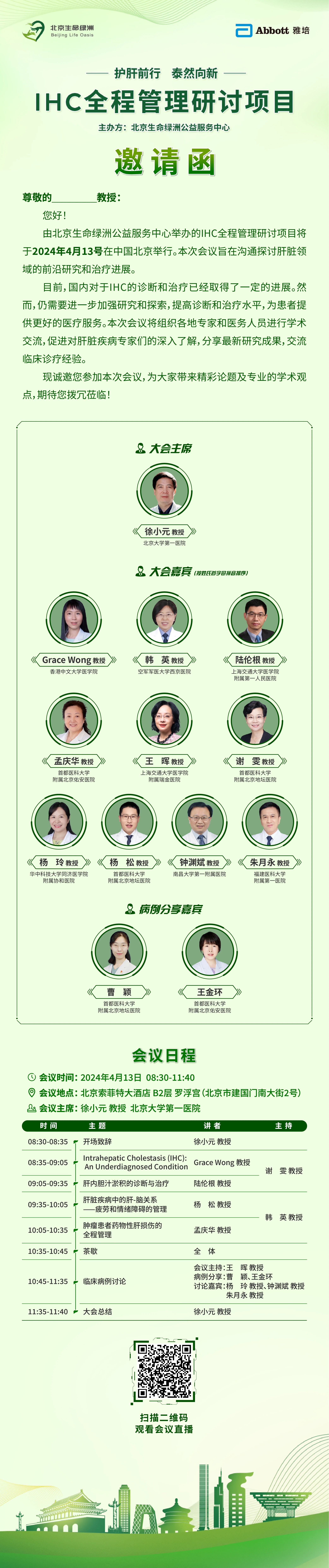 肝内胆汁淤积症(IHC)是一种普遍存在于慢性肝病人群的临床症候群,虽然早期多无症状,但持续进展可导致乏力、瘙痒、尿色加深和黄疸等表现,严重影响患者预后,需要全程监测并及时干预。为提高IHC临床诊治水平,改善我国肝病患者预后,北京生命绿洲公益服务中心特此主办2024“IHC全程管理研讨项目”研讨会议,将于4月13日(本周六8:30)在北京以线下结合线上的形式举行。