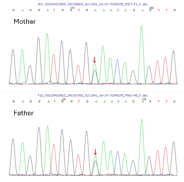 2023年12月,患者在江苏省人民医院感染科就诊,在排除肝炎病毒感染、脂肪肝、药物性和酒精性肝损后,朱传龙教授团队对患者进行代谢性肝病的基因检测,发现SLC10A1基因c.800C>T位点的纯合突变,患者父母的基因检测也发现了基因同样位点的杂合突变(图2),而患者父母并未发病,符合常染色体隐性遗传的规律。