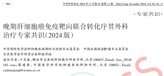 1.中华预防医学会肝胆胰疾病预防与控制专业委员会,中国抗癌协会肝癌专业委员会,北京医学会外科学分会肝脏学组. 晚期肝细胞癌免疫靶向联合转化序贯外科治疗专家共识(2024版)[J]. 中华外科杂志,2024, 网络预发表. DOI:10.3760/cma.j.cn112139-20240814-00245