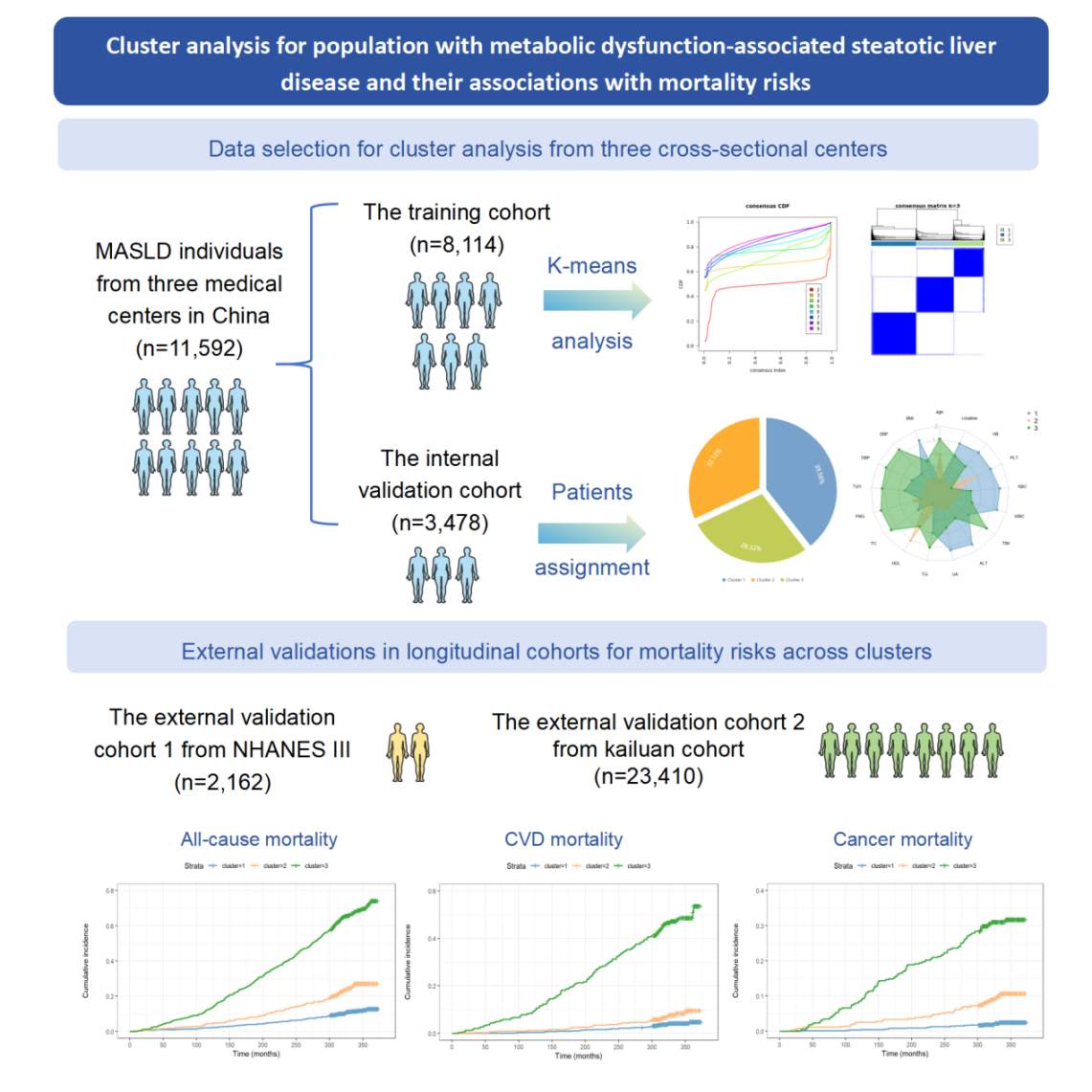 本研究采用的聚类分析方法有效区分出MAFLD人群内部不同的表型,可以较好地预测不良结局。在未来,数据驱动的聚类分析有助于针对MAFLD不同分型进行精准风险评估,推动MAFLD的综合管理。