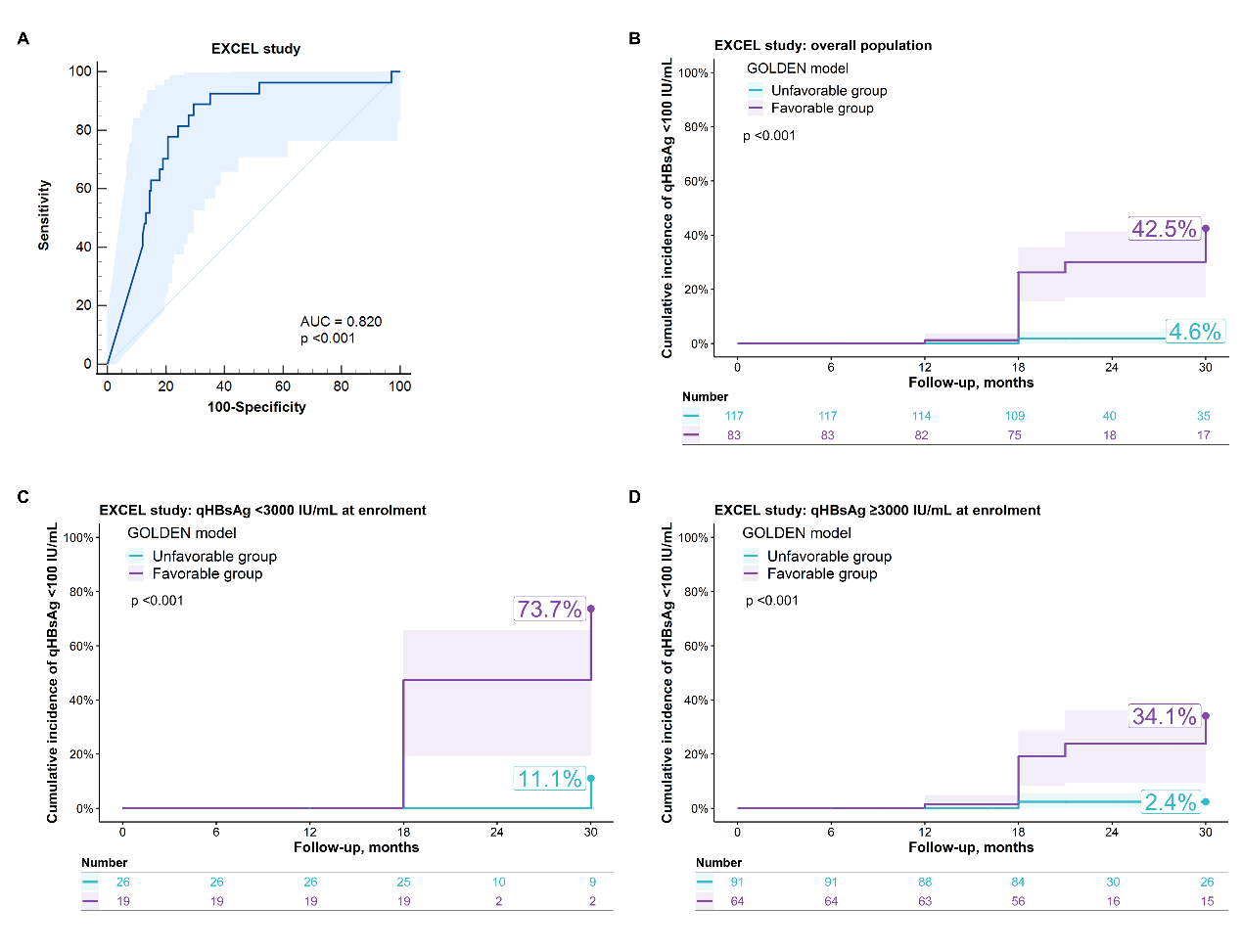 图2. 评估GOLDEN模型在EXCEL研究中预测随访结束时qHBsAg <100 IU/mL的性能。(A)预测随访结束时qHBsAg <100 IU/mL的ROC曲线。(B)总体患者、(C)入组时qHBsAg <3000 IU/mL的患者和(D)入组时qHBsAg ≥3000 IU/mL的患者的随访结束时qHBsAg<100 IU/mL的累积发生率。AUC,曲线下面积;qHBsAg,乙肝表面抗原定量;ROC,受试者工作特征曲线。