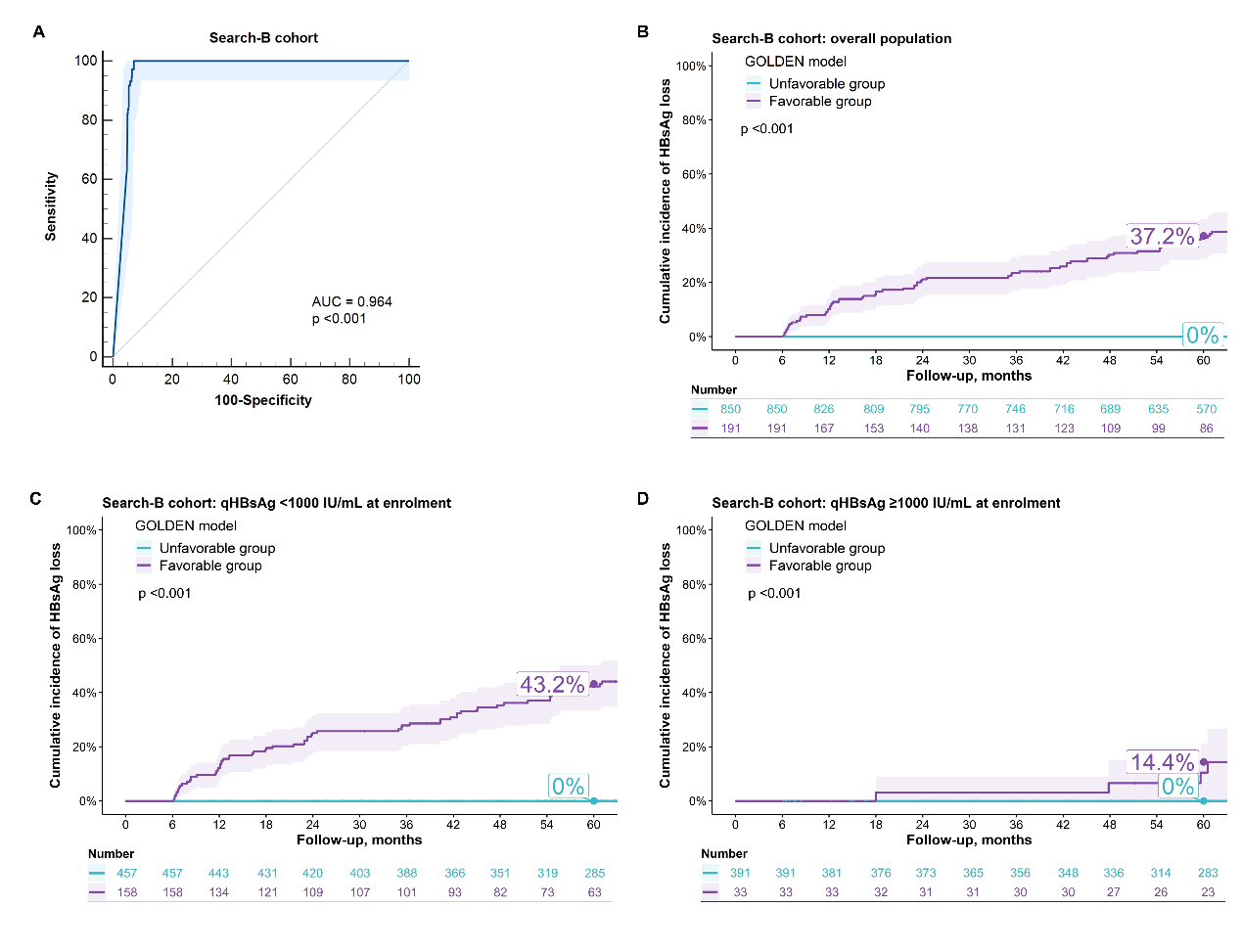 图3. 评估GOLDEN模型在Search-B队列中预测HBsAg转阴的性能。(A)预测随访期间HBsAg转阴的ROC曲线。(B)总体患者、(C)入组时qHBsAg <1000 IU/mL的患者和(D)入组时qHBsAg ≥1000 IU/mL的患者随访期间HBsAg转阴的累积发生率。AUC,曲线下面积;qHBsAg,乙肝表面抗原定量;ROC,受试者工作特征曲线。
