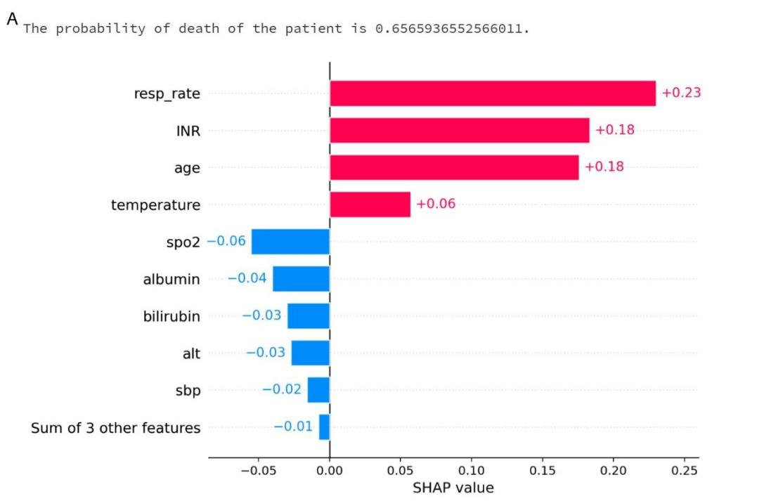 此外,为了推动模型在临床实践中的广泛应用,我们专门搭建了一个简化版模型网站。医生只需输入12项指标数据,如化验结果、患者年龄等信息,模型就能迅速给出患者的30天死亡率预测值。同时,网站还会对影响死亡率的各项指标进行细致分析,用蓝色标识出那些有助于患者远离死亡风险的积极因素,并进行量化呈现;用红色标识出正在恶化、使患者更接近死亡结局的不利因素。(图二)这种直观、清晰的呈现方式,让临床医生能够快速、准确地把握患者病情,为制定科学的治疗方案提供有力支持。