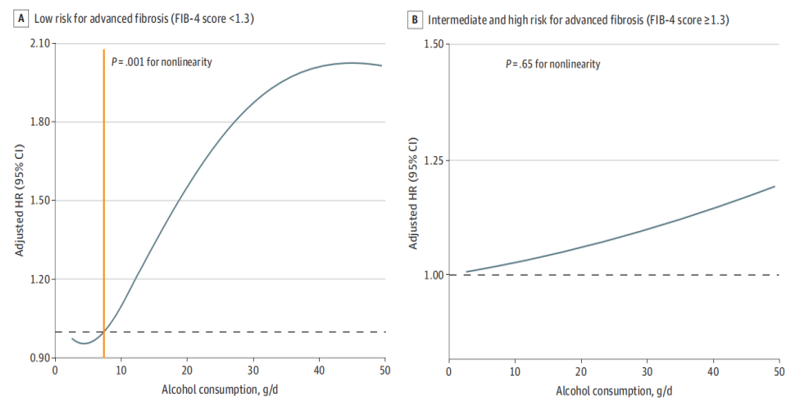 美国一项研究纳入在2003年1月至2007年6月期间转诊至克利夫兰诊所的继发于慢性HCV感染或MASH的成年患者(n=664)。通过对195例MASH相关肝硬化患者的回顾性纵向研究发现,饮酒均为HCC发生的独立预测因子。与戒酒相比,任何水平的饮酒,包括社交饮酒,都与HCC发展风险增加有关。