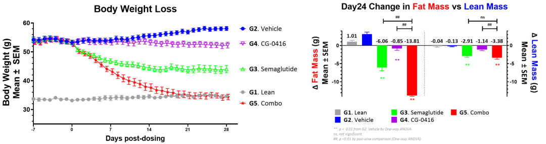 在饮食诱导的肥胖小鼠模型中,口服CG-0416联合semaglutide治疗对比semaglutide单药治疗28天,小鼠各项生理指标改善,具体体现在: