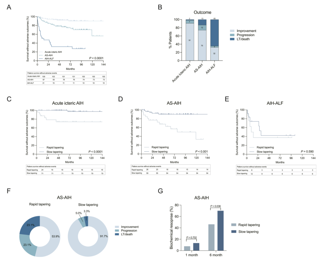 图1. 不同亚型AIH患者中激素减量速度对临床结局的影响。(A)各亚型急性AIH(急性黄疸型AIH、AS-AIH、AIH-ALF)患者中无不良结局(病情进展、肝移植或死亡)生存率的Kaplan-Meier曲线;(B)三组患者的临床结局分布(改善、进展、肝移植/死亡);(C-E)快速减量与慢速减量在不同AIH亚型患者中的无不良结局生存率比较;(F)AS-AIH患者中,不同减量方式对应的改善、进展和肝移植/死亡的分布图;(G)AS-AIH患者在治疗1个月与6个月后的生化缓解率对比。