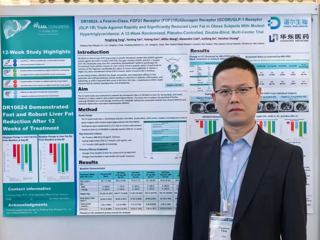 2025年5月7-10日,在荷兰阿姆斯特丹2025年欧洲肝病年会(EASL Congress 2025)上,在新西兰完成的1b/2a期临床研究结果“DR10624, a First-In-Class, FGF21 Receptor (FGF21R)/Glucagon Receptor (GCGR)/GLP-1 Receptor (GLP-1R) Triple Agonist Rapidly and Significantly Reduced Liver Fat in Obese Subjects With Modest Hypertriglyceridemia: A 12-Week Randomized, Placebo-Controlled, Double-Blind, Multi-Center Trial”入选了大会的最新突破(Late-Breaker),通过壁报(大会摘要号:LBP-003)的方式展示了DR10624在肥胖合并高甘油三酯血症受试者中取得的关键研究数据。