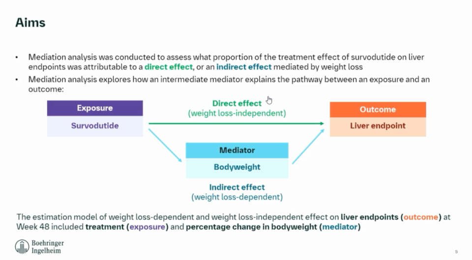 本项研究通过Mediation分析,评估Survodutide对肝脏终点的作用中,肝脏直接作用及通过减重介导的间接作用的比例(图1)[3]。