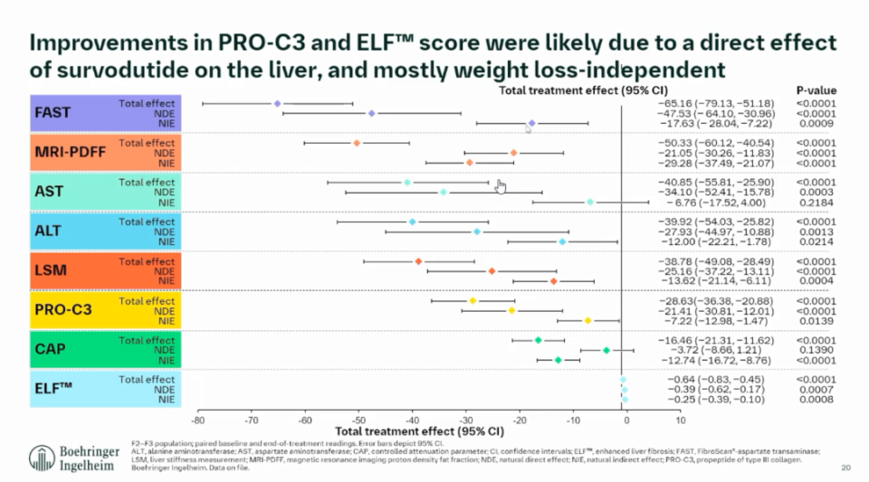 在Survodutide组纤维化改善且MASH未恶化效应中,仅 36.32%(95%CI:-15.03%- 87.66%)由减重介导。ELF评分(% med:38.55%, 95%CI:14.39%-62.72%)、PRO-C3(% med:25.23%, 95%CI: 4.35%-46.12%)、FAST评分(% med: 27.06%, 95%CI:10.62%-43.50%)和LSM(% med: 35.13%, 95%CI:14.58%-55.68%)等NIT指标减重的介导作用较弱,提示survodutide对肝脏的直接作用在纤维化改善的主要因素(图2,3,4)。