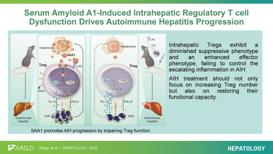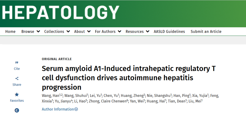 原文链接:Wang, Han,Wang, Shuhui,Lei, Yu,et al. Serum amyloid A1-Induced intrahepatic regulatory T cell dysfunction drives autoimmune hepatitis progression. Hepatology ():10.1097/HEP.0000000000001419, June 9, 2025.
