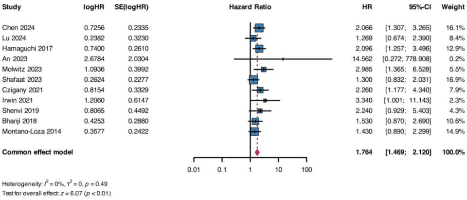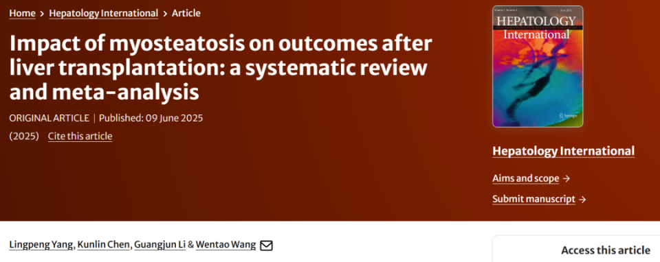 参考文献:Yang L, Chen K, Li G, Wang W. Impact of myosteatosis on outcomes after liver transplantation: a systematic review and meta-analysis. Hepatol Int. Published online June 9, 2025. doi:10.1007/s12072-025-10845-z