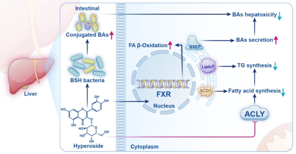 研究结果表明,金丝桃苷可激活法尼醇X受体(FXR),促进脂肪酸氧化及肝脏中胆汁酸的外流;此外,金丝桃苷能抑制肝脏ATP柠檬酸裂解酶(ACLY),并与被激活的FXR协同作用,抑制新生脂肪生成。同时,金丝桃苷还可抑制与胆盐水解酶(BSH)活性相关的肠道微生物,从而增加回肠胆汁酸(尤其是结合型胆汁酸)的生成,降低内源性胆汁酸对肝脏的毒性。