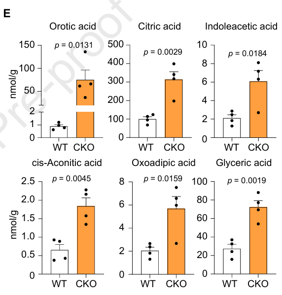 图3. CKO小鼠肝脏中六种最显著升高的代谢物浓度