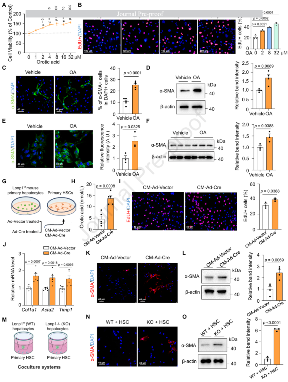 体内实验进一步验证了这一通路:在高脂饮食(HFD)联合CCl4诱导的MASH模型中,补充5% OA可使小鼠肝组织中α-SMA的表达上调2.3倍,胶原沉积面积增加1.7倍。而来自LONP1缺陷肝细胞的条件培养基(CM)中OA水平升高35%,可显著促进HSCs的增殖和激活,这一效应可被OA中和抗体逆转(图5G-L)。这些结果揭示了肝细胞通过分泌OA调控HSC功能的全新机制。