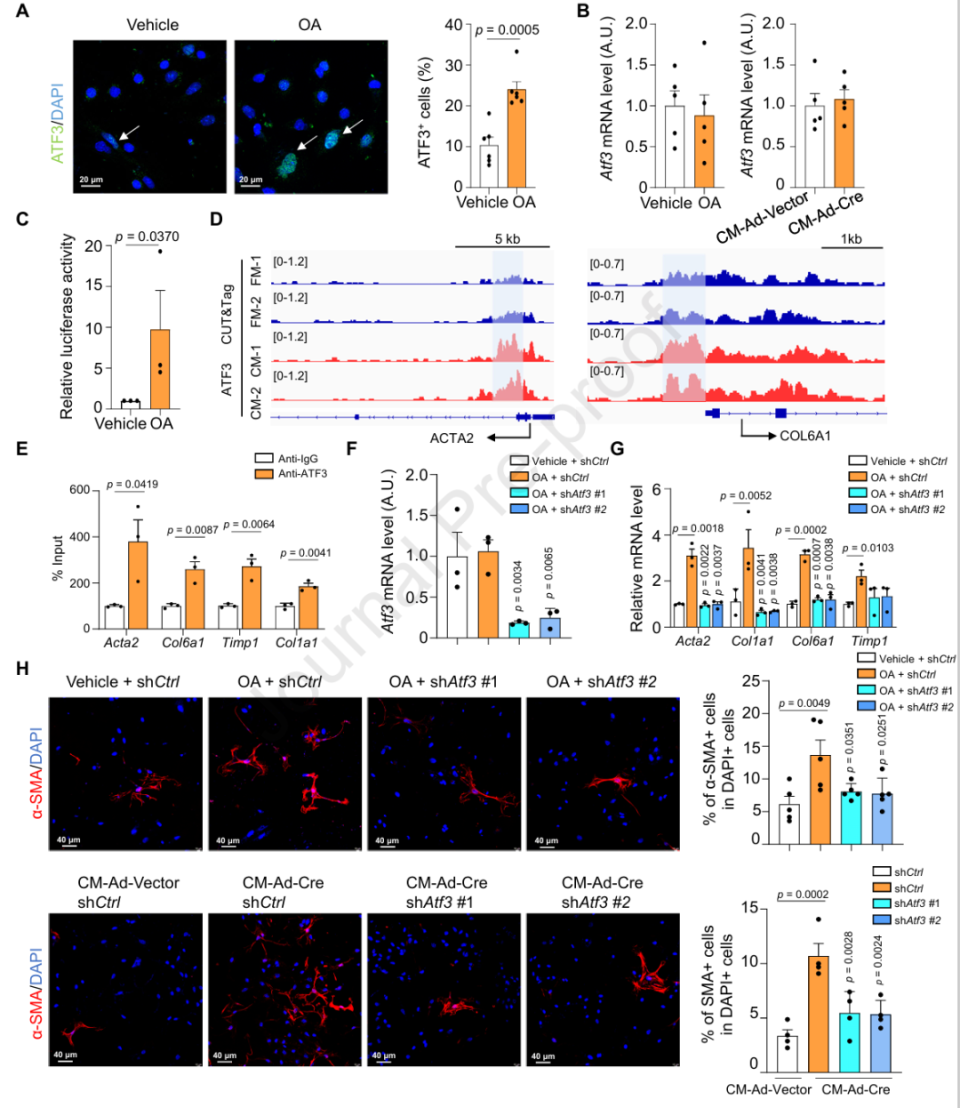 体外实验显示,OA可剂量依赖性促进人HSC细胞系LX-2的增殖,当OA浓度为32μM时,EdU阳性细胞比例较对照组升高2.1倍(图5A、B)。同时,OA处理可使原代小鼠HSCs中α-SMA的表达上调1.8倍,且增强其对TGF-β1的响应(图5C-F)。机制上,OA通过促进激活转录因子3(ATF3)的核定位增强其转录活性,而ATF3可直接结合ACTA2、COL1A1等纤维化基因的启动子,驱动其表达(图6D、E)。敲除ATF3可完全阻断OA诱导的HSC激活,证实ATF3是OA作用的关键下游分子(图6F-H)。