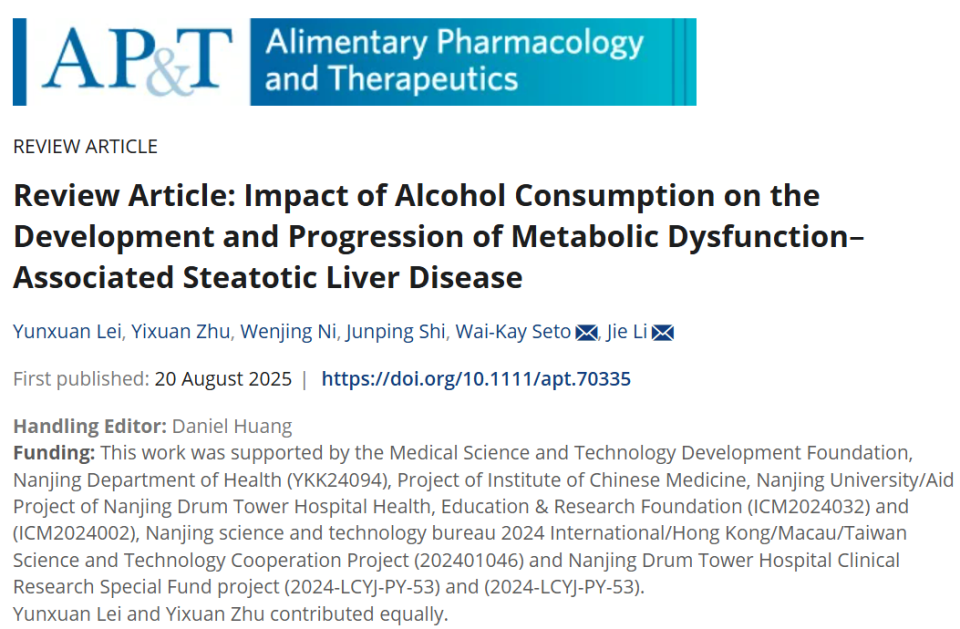 编者按:随着全球肥胖流行及饮食、生活方式的改变,代谢相关脂肪性肝病(MASLD)已成为全球最常见的慢性肝病之一,影响超过30%的亚洲及全球人口。MASLD可逐步进展为代谢相关脂肪性肝炎(MASH)、肝纤维化、肝硬化,最终诱发肝细胞癌(HCC),且流行病学预测显示其疾病负担将在未来持续攀升。传统上,MASLD与酒精性肝病(ALD)被视为独立疾病,但新证据显示饮酒与MASLD存在显著交互作用。近日,中国香港大学司徒伟基(Wai-Kay Seto)教授团队与南京大学医学院附属鼓楼医院李婕教授团队发表于Alimentary Pharmacology & Therapeutics杂志的一项研究,系统阐明了饮酒对MASLD进展的多维度影响,重点分析了其潜在病理生理机制、临床意义及风险分层面临的挑战。