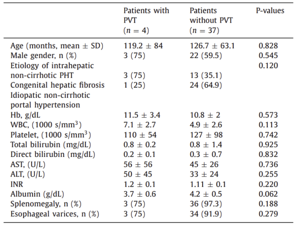 本研究共纳入41例肝内非肝硬化门静脉高压患儿,包括CHF 16例、INCPH 25例。就诊时的平均年龄为126±64.2个月,平均随访时间为23.1±25.6个月。4(9.7%)例发生PVT,包括CHF 1例、INCPH 3例。肝内非肝硬化门脉高压症患儿中PVT的患病率为9.7%。