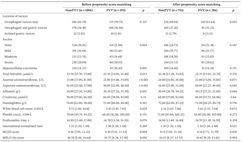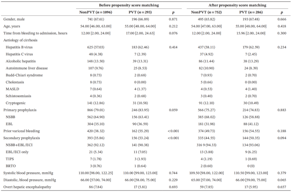 本研究总计纳入1389例患者,其中21.1%合并PVT。PVT患者中,大多数为轻度(54.2%)或部分闭塞(26.9%),仅8.7%为完全闭塞,而仅有7.2%的PVT患者在该次入院前正在接受抗凝治疗。与非PVT组相比,PVT组患者既往出血和接受过TIPS的比例更高。研究团队还采用倾向性匹配(PSM),尽量平衡两组的基线差异,提高结论可靠性。
