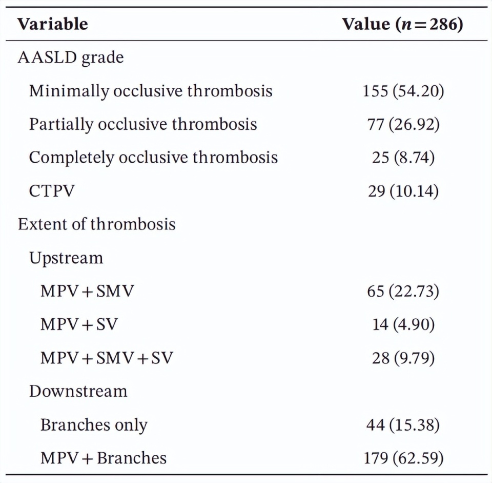 PVT的分型依据AASLD标准:①轻度(moPVT):主干残余管腔≥50%;②部分闭塞(poPVT):主干残余管腔<50%;③完全闭塞(coPVT):主干残余管腔0%;④海绵样变(CTPV):主干血管结构不可见,且伴有肝门部侧支循环开放,提示慢性血栓形成。