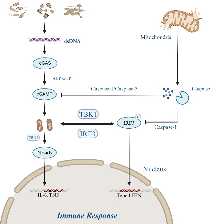 环鸟苷酸-腺苷酸合成酶(cGAS)催化三磷酸腺苷(ATP)和三磷酸鸟苷(GTP)合成环鸟苷酸-腺苷酸(cGAMP),并通过内质网(ER)驻留的适配蛋白STING激活干扰素(IFNs)。随后,STING通过TANK结合激酶1(TBK1)激活转录因子核因子κB(NF-κB)和干扰素调节因子3(IRF3),从而调控炎症活动。TBK1:TANK结合激酶1;IRF3:干扰素调节因子3;NF-κB:核因子κB;TNF:肿瘤坏死因子;IFN:干扰素。