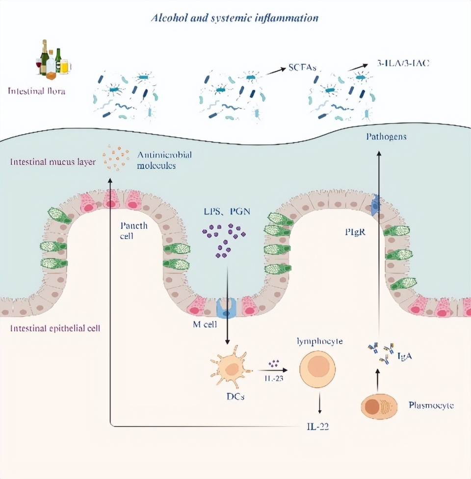 酒精导致肠道微生物群过度生长,其分泌短链脂肪酸(SCFAs)和色氨酸代谢产物。脂多糖(LPS)和肽聚糖(PGN)经肠道黏液层,通过M细胞和3型天然淋巴细胞激活,最终产生作用于抗菌分子的白细胞介素-22(IL-22)。同时,浆细胞通过免疫球蛋白A(IgA)结合致病菌。DCs:树突状细胞;LPS:脂多糖;PGN:肽聚糖;SCFAs:短链脂肪酸;3-ILA:3-吲哚基乳酸;3-IAC:3-吲哚丙烯酸;PIgR:多聚免疫球蛋白受体。