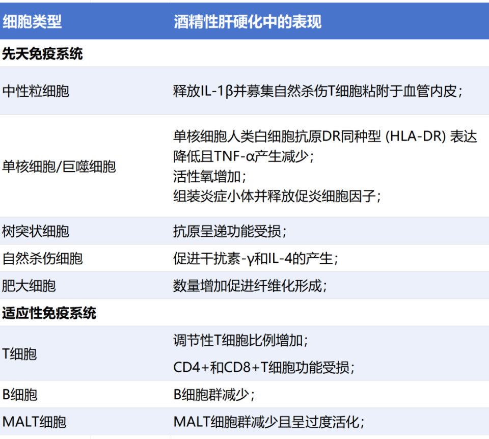 B细胞的功能障碍则直接影响体液免疫:尽管患者血清总IgA、IgG、IgM水平升高,但B细胞群数量减少且特异性抗原-抗体反应减弱,无法有效产生针对病原体的保护性抗体。这也是酒精性肝硬化患者自发性细菌性腹膜炎(SBP)风险升高的重要原因。此外,黏膜相关淋巴组织(MALT)细胞数量减少且过度活化,其抗菌细胞因子分泌与细胞毒性反应存在缺陷,进一步破坏了肠道黏膜的局部免疫防御,加剧细菌易位与炎症循环。
