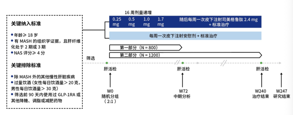 MASH相关的NIT效应终点包括:丙氨酸氨基转移酶(ALT)下降≥17 U/L,FAST评分降低≥0.22;纤维化相关的NIT效应终点包括:振动控制瞬时弹性成像(VCTE)测得肝脏硬度值(LSM)降低≥30%,增强肝纤维化(ELF)评分降低≥0.5分;组织学终点包括MASH缓解和纤维化改善。