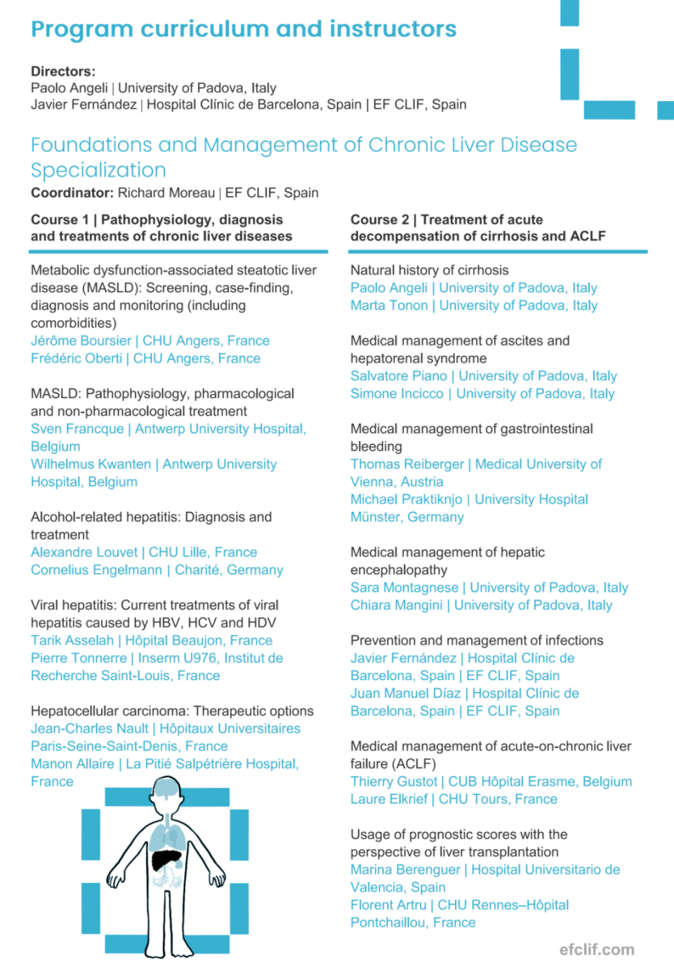 授课讲师来自全球多家知名医疗机构及研究机构,例如法国CHU Angers医院、比利时安特卫普大学医院、德国夏里特医学院、西班牙巴塞罗那临床医院等,教研团队逾六十位专家,均为来自全球多个知名肝病研究和临床中心的活跃研究者与临床医生,涉及肝病学、消化病学、重症医学等多个与肝病相关的领域,具备临床实践或科研工作经验,确保课程内容与当前科研和临床实践紧密同步。