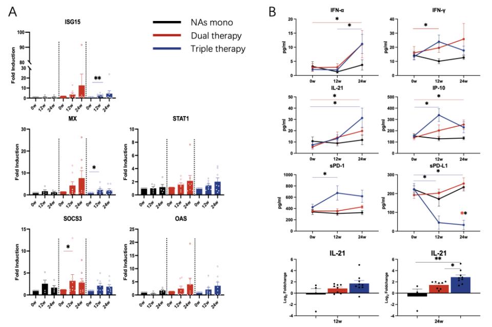 在在对CHB患者的治疗中,三联治疗相较于单药治疗和二联治疗,在EOT时展现出了更为显著的HBsAg下降。在ISGs和细胞因子方面,随着疗程延长,三联治疗组患者PBMCs中MX1和ISG15在内的ISGs表达水平,血清中IFN-α、IL-21、IP-10及可溶性PD-1(sPD-1)在内的细胞因子水平显著增高,而可溶性PD-L1(sPD-L1)水平显著降低。