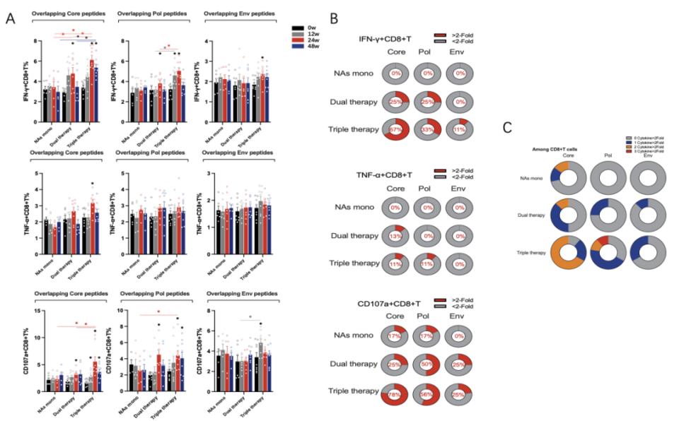 与基线相比,EOT时三联治疗组明显增强的特异性T细胞应答还包括Core特异性CD8+T细胞的IFN-γ、TNF-α分泌,Pol特异性CD8+T细胞的IFN-γ分泌和脱颗粒反应,及包膜肽段(Env)特异性CD8+T细胞的IFN-γ分泌水平。