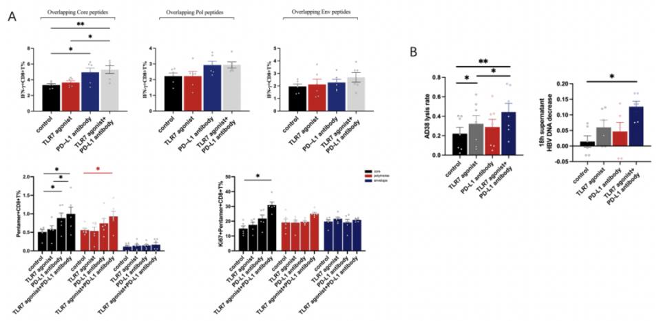 TLR7激动剂与PD-L1抗体的联合应用可通过诱导ISGs表达、促进抗病毒细胞因子产生、提升HBV特异性CD8+T细胞应答等机制重建病毒抑制期CHB患者的抗病毒免疫,并助力改善临床转归。