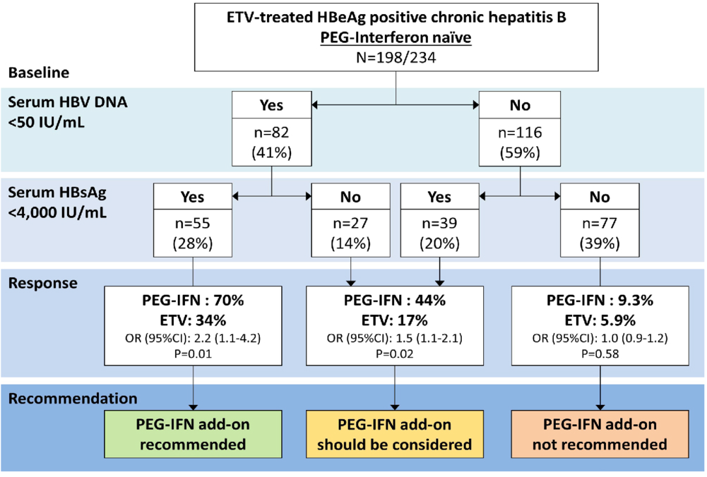 研究者从两项研究者发起的随机对照试验纳入HBeAg阳性患者。患者先接受ETV治疗至少24周,然后(在基线)被分配至ETV + PegIFN-α治疗24~48周,或持续ETV单药治疗24~48周。治疗应答定义为在PegIFN治疗停止48周后,患者HBeAg清除且HBV DNA<200 IU/mL。对开始PegIFN治疗时的血清HBsAg和HBV DNA的截止值与非治疗随访时的应答之间的相关性进行分析,以建立临床决策模型。