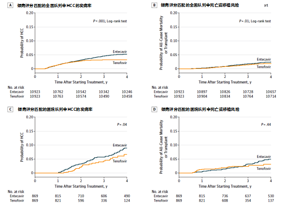 全因死亡率或肝移植率在TDF组也显著低于ETV组,0.36/百人年vs.0.50/百人年,多因素分析HR为0.77,P=0.004。倾向评分匹配分析HR为0.79,P=0.01。