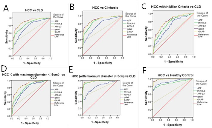 A-F:标志物单独、联合或相关模型鉴别HCC与其他各组的受试者操作曲线