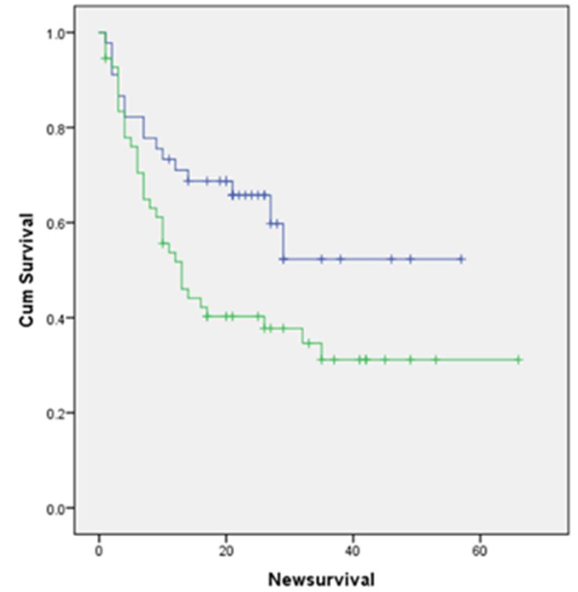 图1.两组患者根据miR-122的表达情况:(1)miR-122低水平表达(<4.3 log10 copies):绿线(2)miR-122高水平表达(≥4.3 log10 copies):蓝线[Y轴显示累积(Cum)生存,X轴显示总生存时间。]