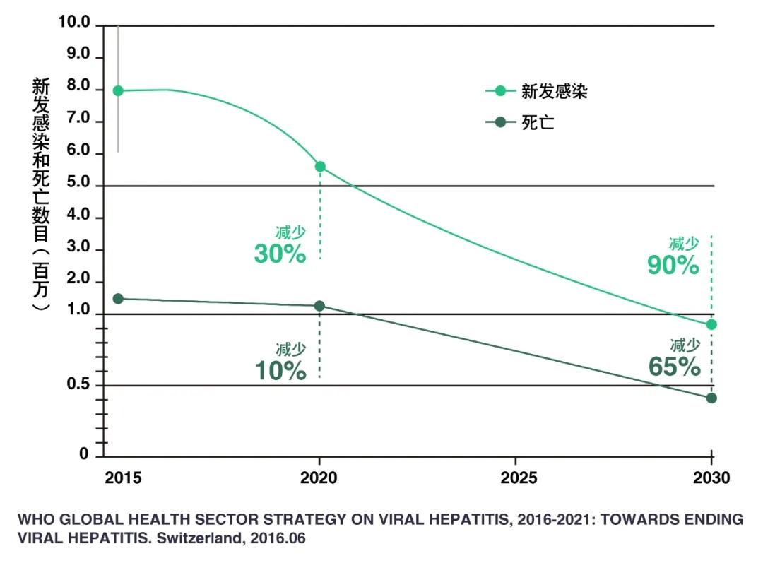 WHO消除病毒性肝炎重大公共卫生威胁的目标是减少慢性乙型肝炎和丙型肝炎感染新增病例和死亡病例,要求在2015年基础上,2030年新发感染率降低90%、死亡率降低65%、诊断率提高90%及治疗率提高80%。