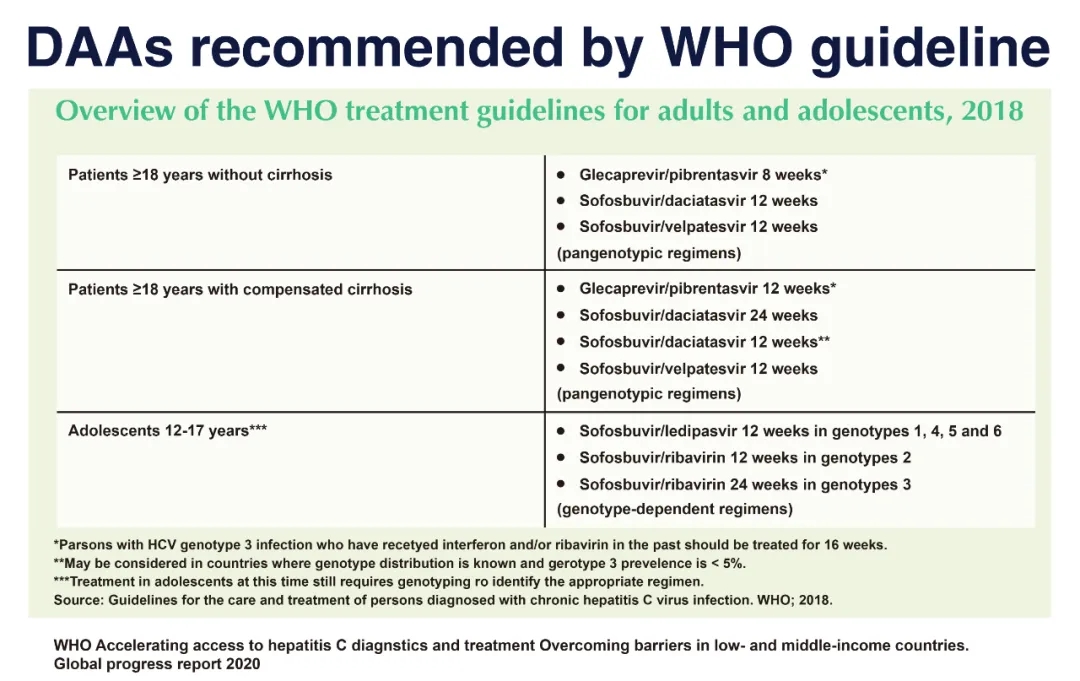 早在2018年,WHO就针对成年和青少年丙型肝炎患者的治疗给出明确用药建议(图4),为各国临床实践治疗丙型肝炎提供了重要参考。