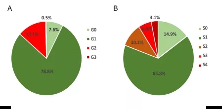 382例IT-CHB患者中,82例(21.5%)存在显著肝损伤,其肝组织损伤程度如下:炎症活动度分级:G0 29例(7.6%)、G1 301例(78.8%)、G2 50例(13.1%)、G3 2例(0.5%);纤维化分期:S0 57例(14.9%)、S1 251例(65.7%)、S2 39例(10.2%)、S3 23例(6.0%)、S4 12例(3.1%),详见图1。