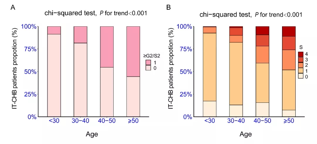 图2. IT-CHB患者年龄与肝组织损伤的关系